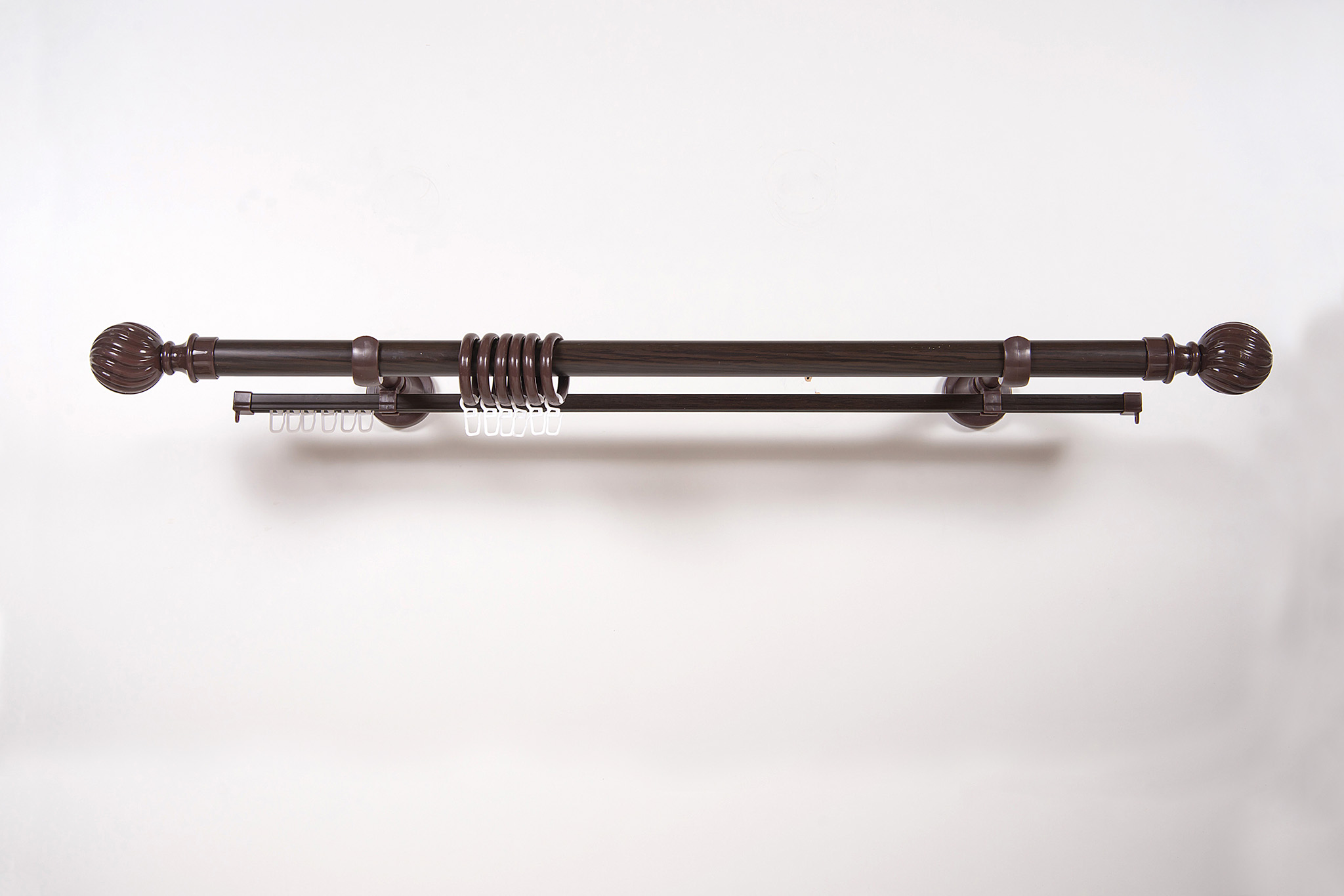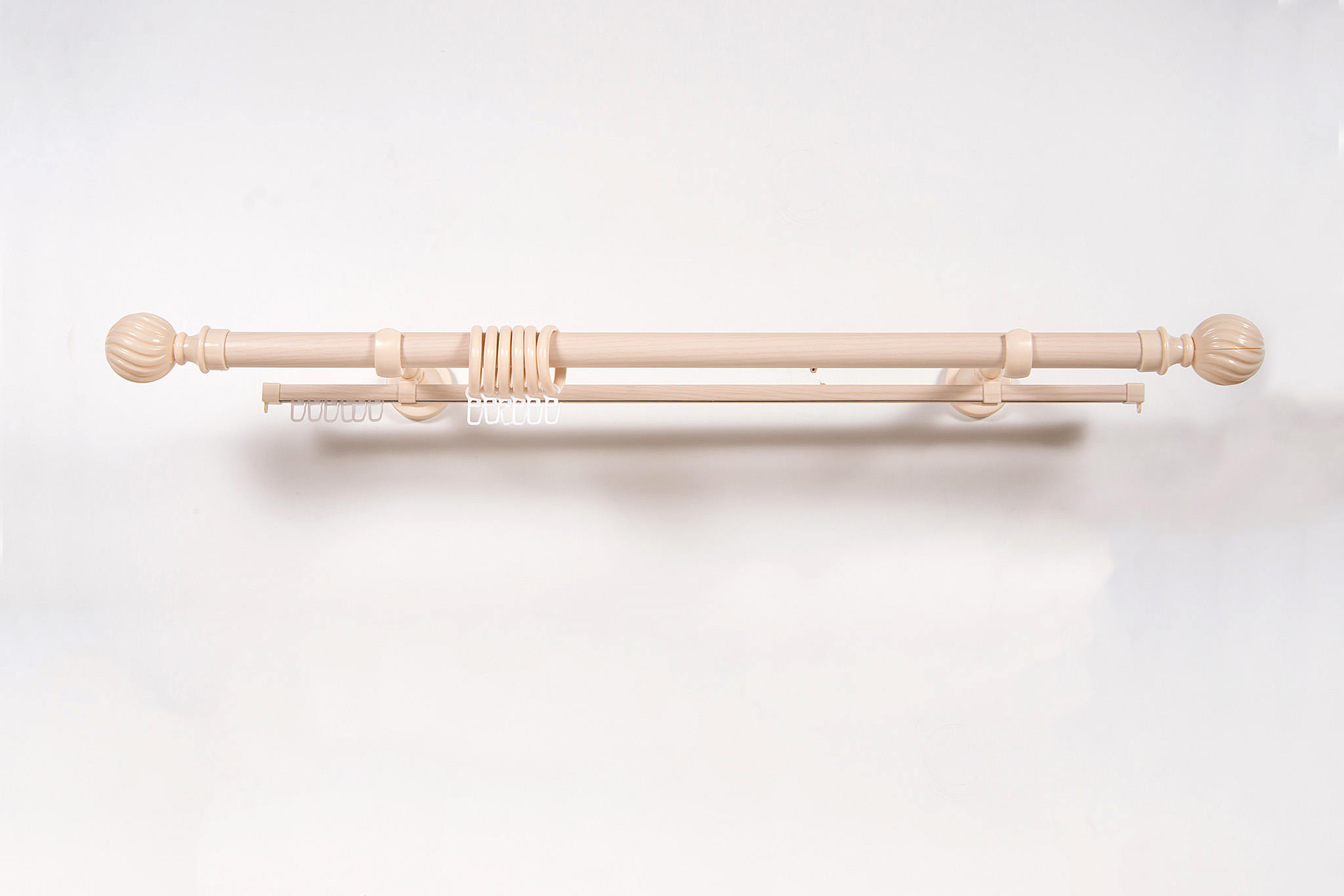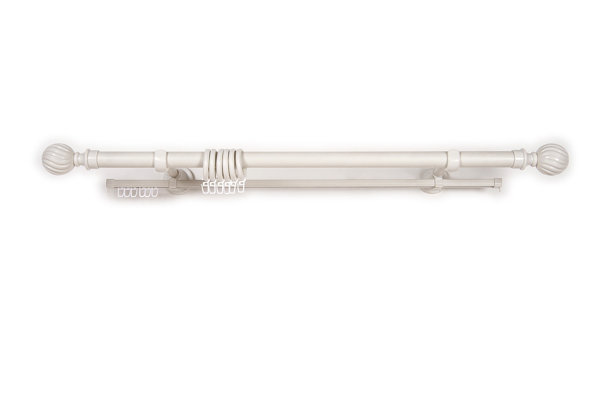 240 см - 3 шт., дизайнерский наконечник «Италия» 2шт (удлиняют карниз на 19см), оригинальные кольца из материала PP, крючки на кольцо, крючки на шину,