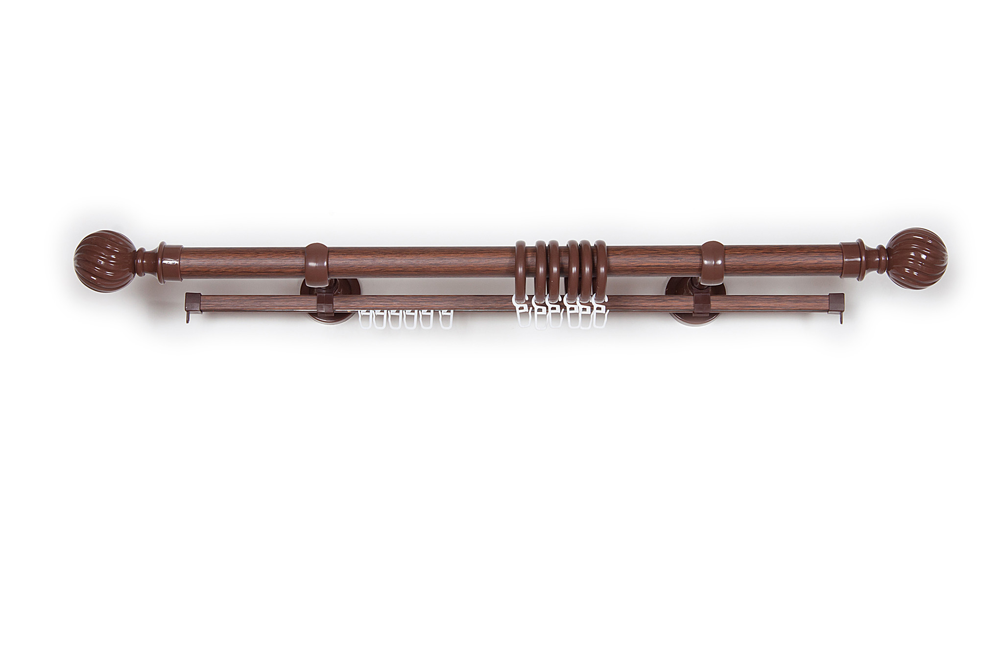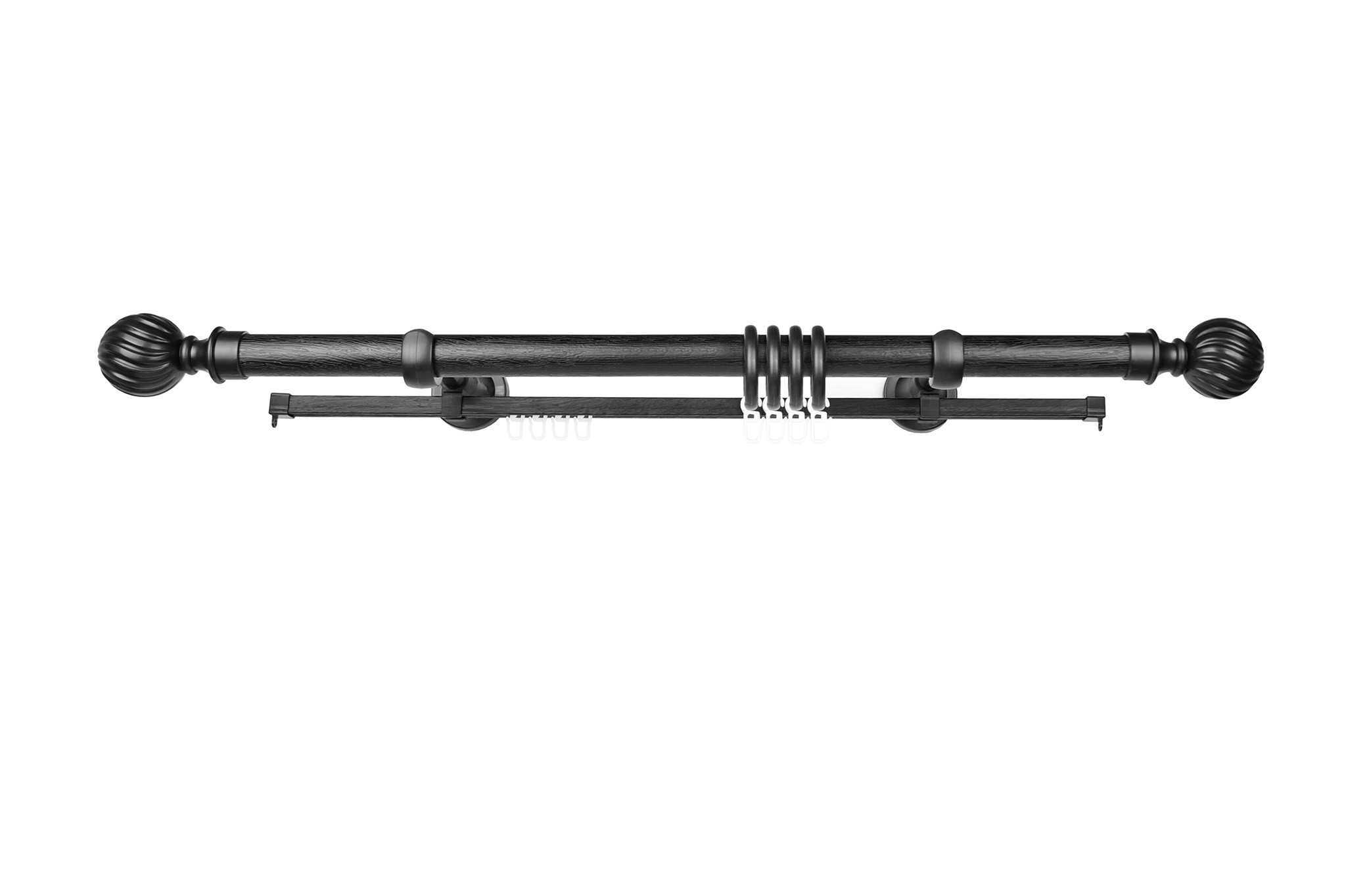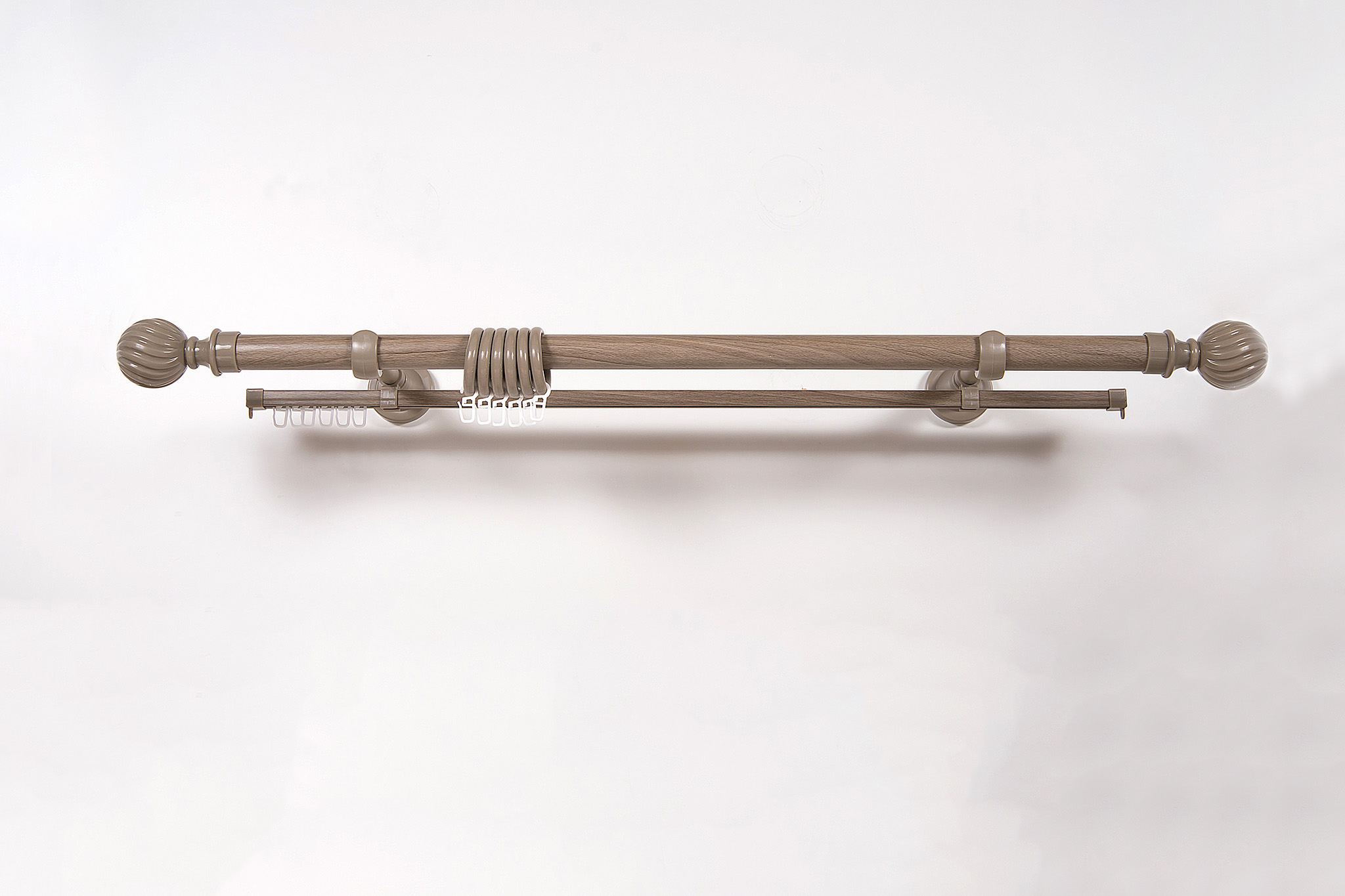 240 см - 3 шт., дизайнерский наконечник «Италия» 2шт (удлиняют карниз на 19см), оригинальные кольца из материала PP, крючки на кольцо, крючки на шину,