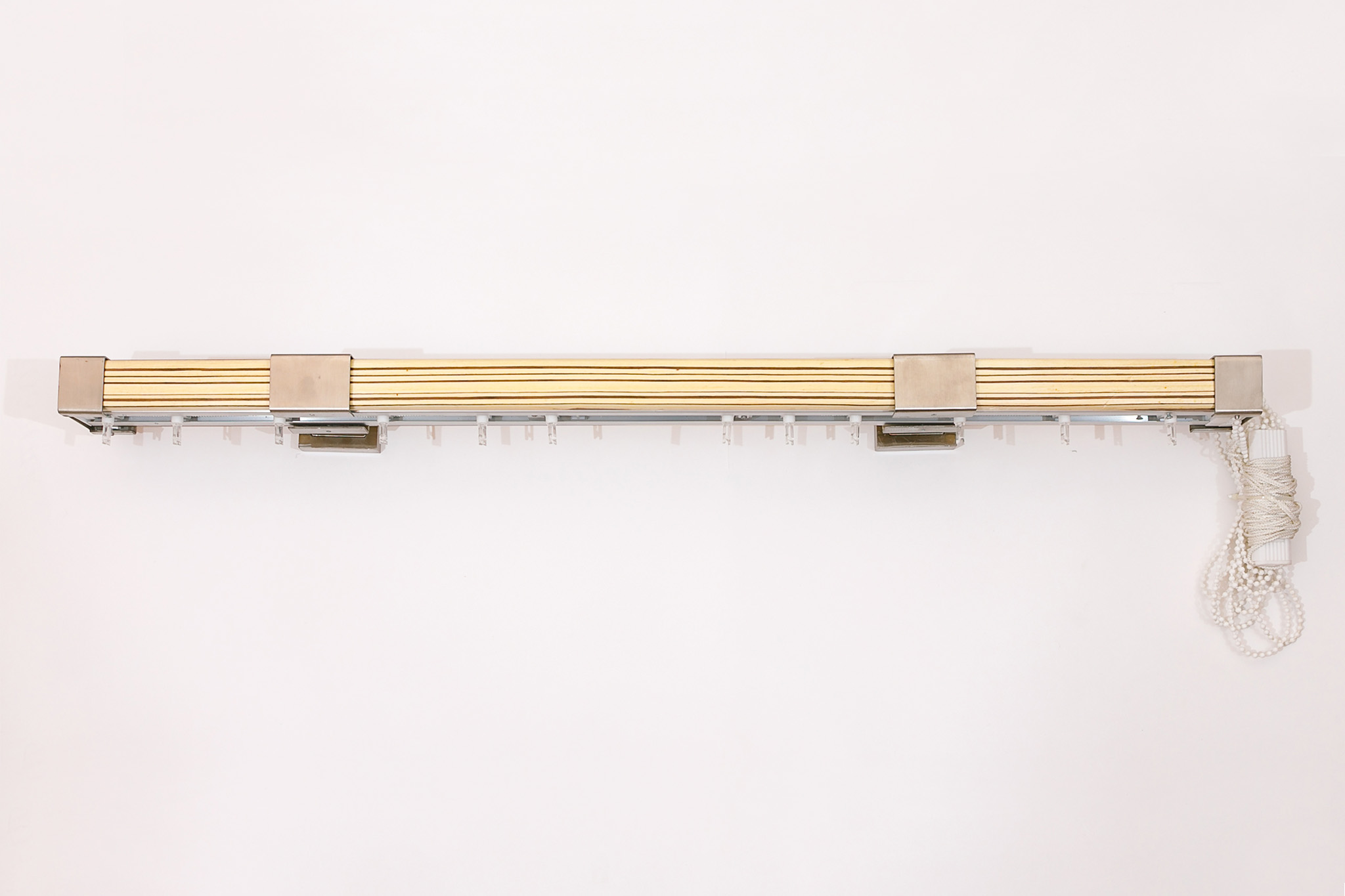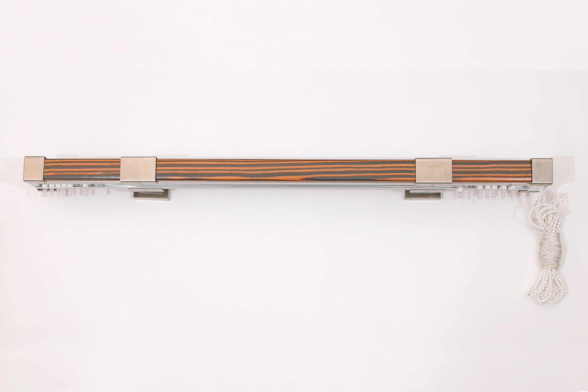 Карниз на основе прямоугольного профиля из редкой породы дерева с подъемно-раздвижным механизмом, со стальными кронштейнами и заглушками в цвет «матовой нержавеющей стали»